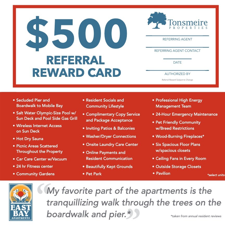 • "East Bay Apartment Homes has such a great location, staff and community! I highly recommend this property in Daphne for anyone searching for a lovely home in a wonderful location."